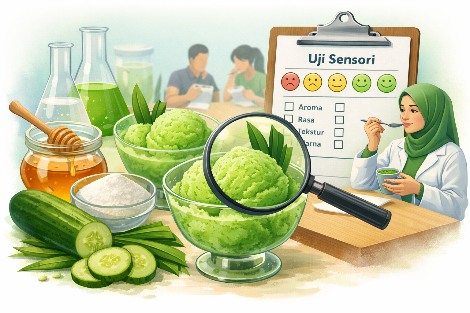 Sumber : Danya Mozza Elshiva, Syarifa Ramadhani Nurbaya*, Lukman Hudi AM. Sensory Evaluation of Cucumber Sherbet ( Cucumis sativus L .) Based on Variation of Fragrant Pandan ( Pandanus amaryllifolius ). 2025;10(1):53–61.