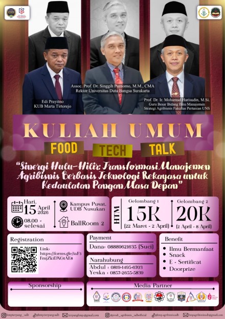 Fakultas Sains dan Teknologi (FST) dengan bangga menginformasikan kegiatan Kuliah Umum Food Tech Talk bertajuk: